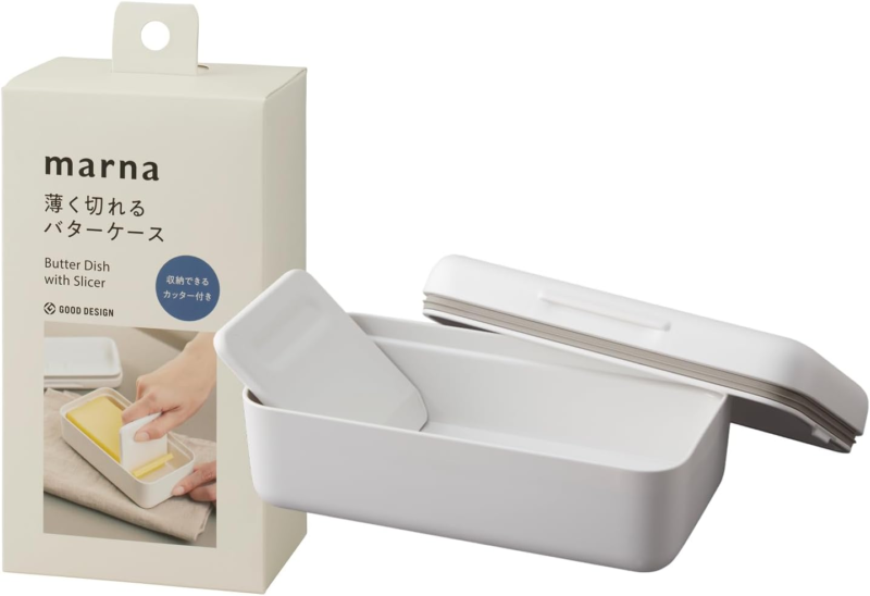 個のバターケースは、バターナイフが付属でついていて、使うときにそのバターナイフで適量をカットして使っていくものになります。ナイフの切り味も良くて使い勝手がよくて気に入っています。