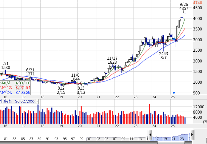 2020年終わりごろから綺麗な右肩上がりでチャートを描いています。2025年からはさらに一段と大きく上昇を見せている状況です。