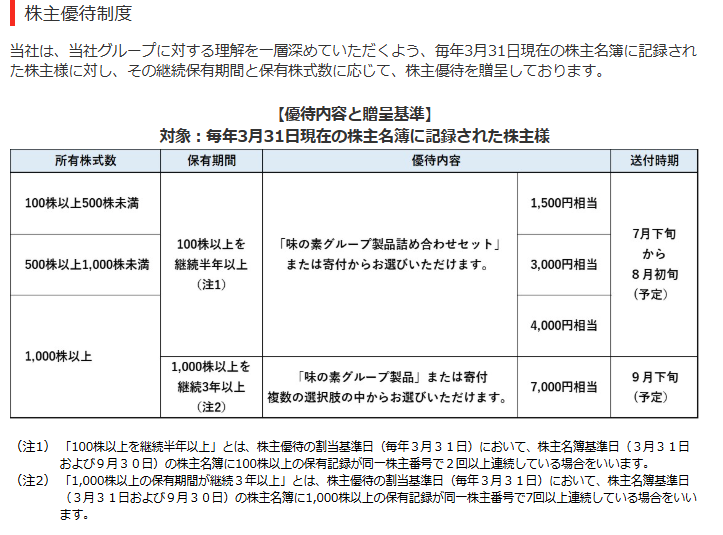 100株以上を継続半年以上保有で1,500円相当の「味の素グループ製品詰め合わせセット」がもらえます。