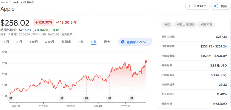 Googleファイナンスから5年チャートです。見てわかるようにさすがの大企業、右肩上がりで成長をし続けています。