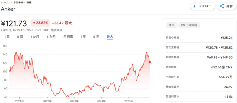 Ankerは中国市場で上場しています。2023年ごろまで下落基調、その後大きく反転、今現在も上昇を続けているといった動きです。