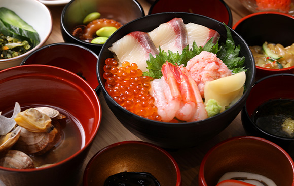 北海道グルメのひとつといえば、いくら!キラキラな粒は、見た目だけでなく醤油漬けにした濃厚な味も自慢の一品。いくらを含めた海鮮をこれでもか!と豪快に盛った海鮮豪快盛を朝からいただけます。
