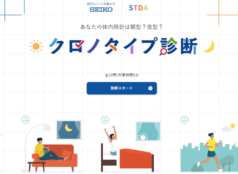 全19問・約5分で、自分の体内時計が朝型寄りか夜型寄りかを確認できます。セイコーの診断では、強い朝型・朝方・中間型・夜型・強い夜型の5タイプで見られるので、「まずは自分の傾向を知りたい」という人にはかなり使いやすいかと思います。