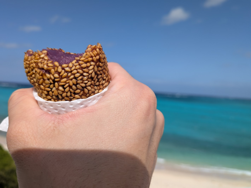 絶景の海を見ながら紅芋もちをパクリ。立て続けに食べていただけあって一つだけ食べてみましたが、意外とぺろりと食べられる軽さでゴマもたっぷりでおいしかったです。