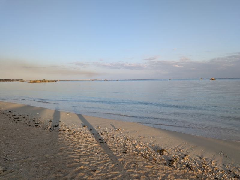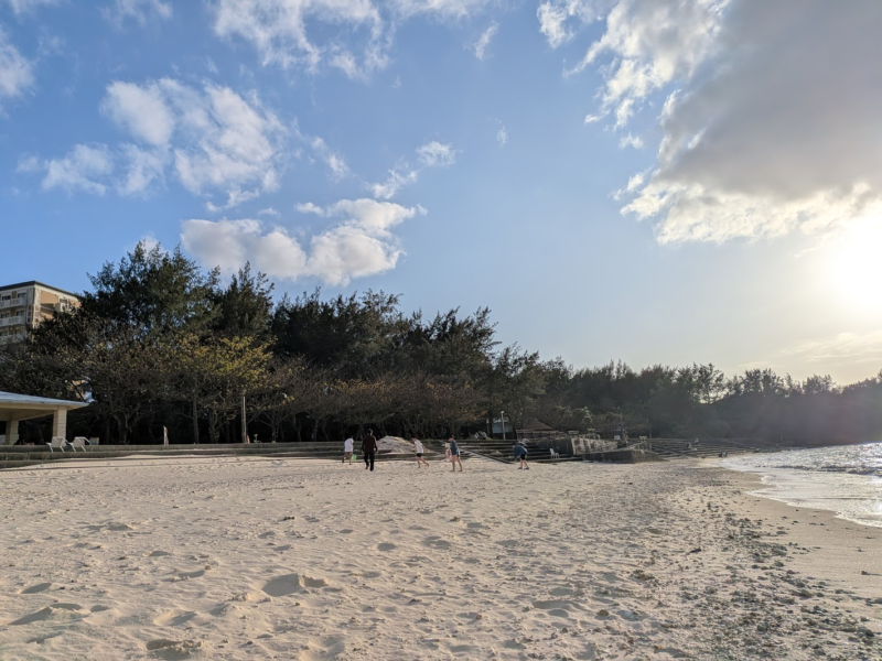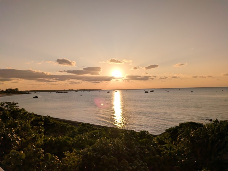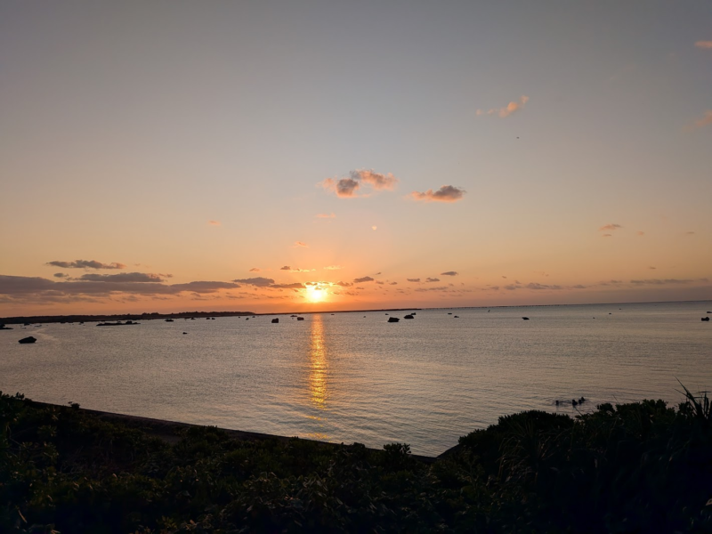 夕日がめちゃきれい。干潮のときには砂浜が大きく広がるらしいですが、夕方は夕方で夕日に照らされてとてもきれいでした。
