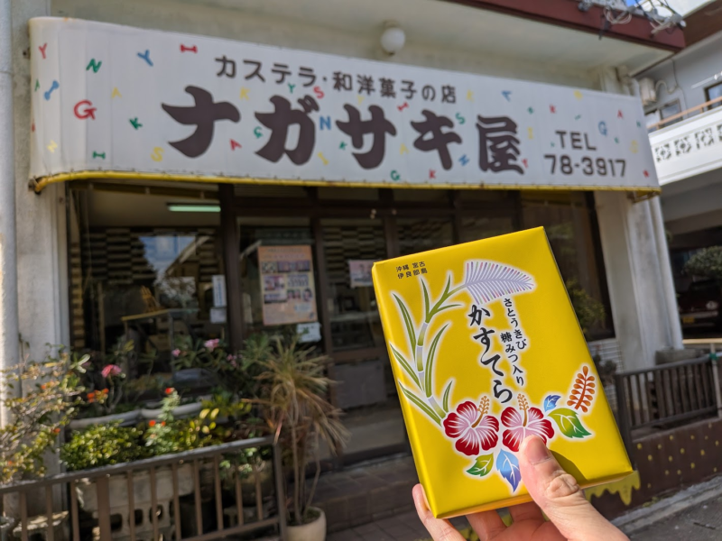 橋を渡ったら、お土産に黒糖カステラを購入しました。宮古島にしかないと話題のカステラ屋さん「ナガサキ屋」