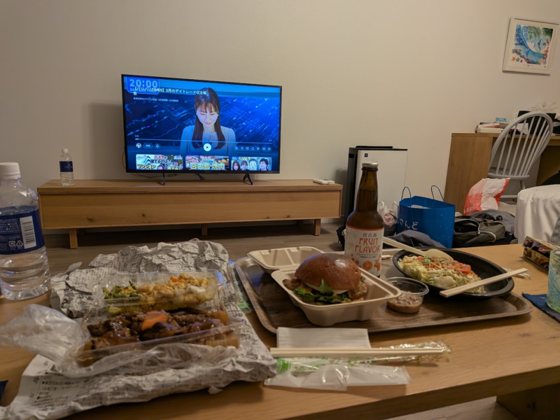 ちょっと絵面的にはきれいではないですが、晩御飯の風景。ビールを飲みながら二人でゆったりと楽しみました。買ってきたお惣菜とホテルで注文できるハンバーガーなんかを楽しみながら夜を過ごしました。