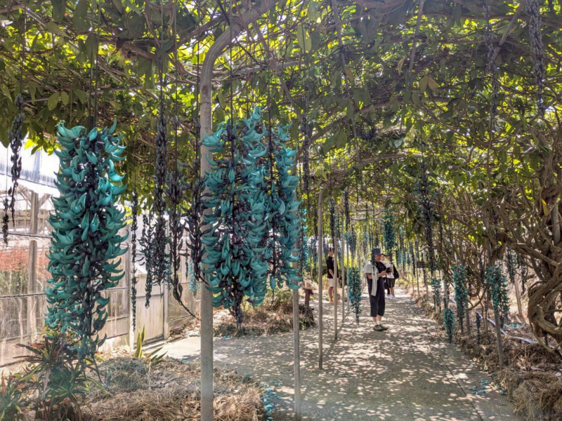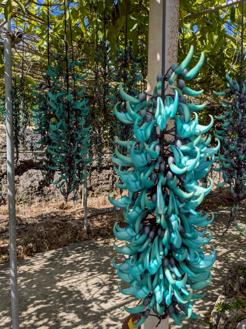 ちょうど行ったタイミングで咲いていた珍しい花、ヒスイカズラ。宝石の翡翠(ひすい)のような鮮やかな神秘的な花を咲かせるのが特徴でその名がついています。