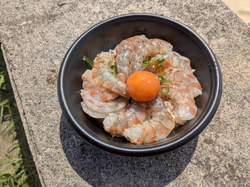 お目当ての生エビ丼を購入。お店の向かい側には海が広がっていてそのスペースで海を眺めながら食べることができます。