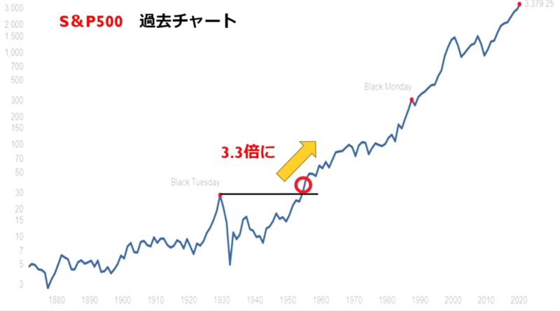 次は1929年の高値を超えると、株価は3.3倍になりました。