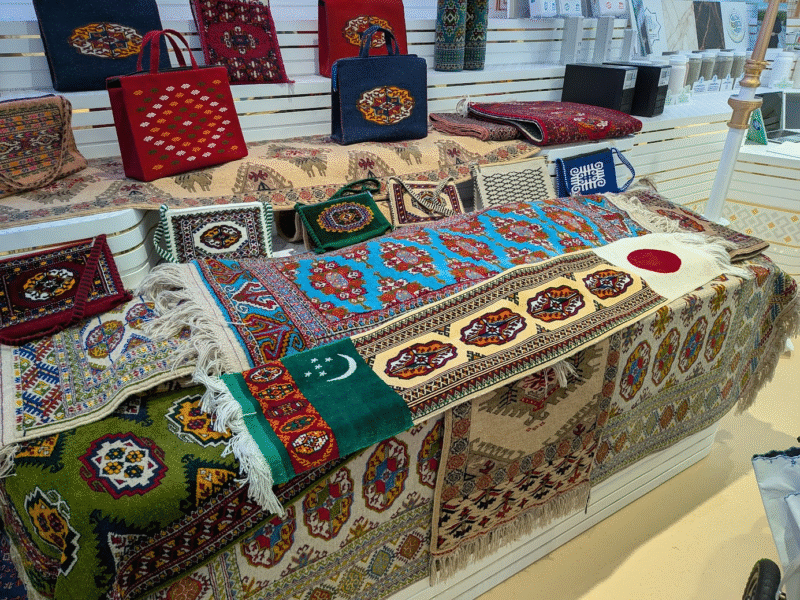 トルクメニスタンで実際に使われているものであったりの展示。親日国のようで、日本の国旗が入った織物も展示されていました。