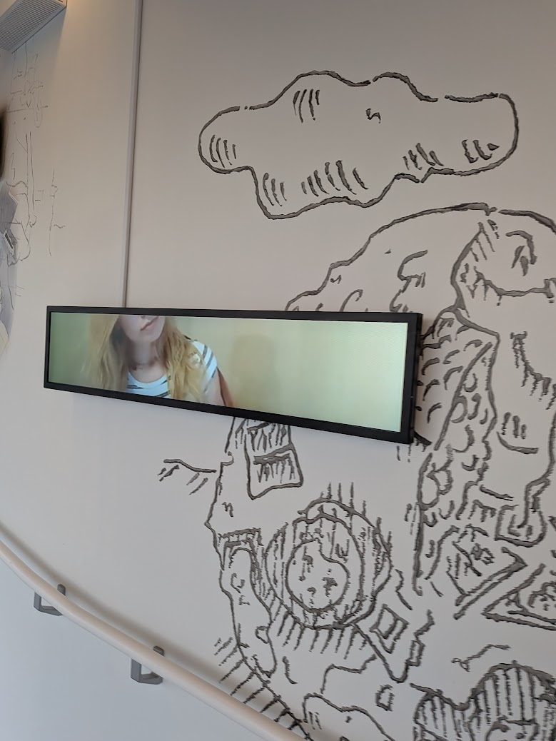 中に入ると、部屋全体を覆うようなスクリーンに明るい映像が流れていました。一番下段に日本語で翻訳があったので、少々見づらいながらも最前列で映像を視聴しました。