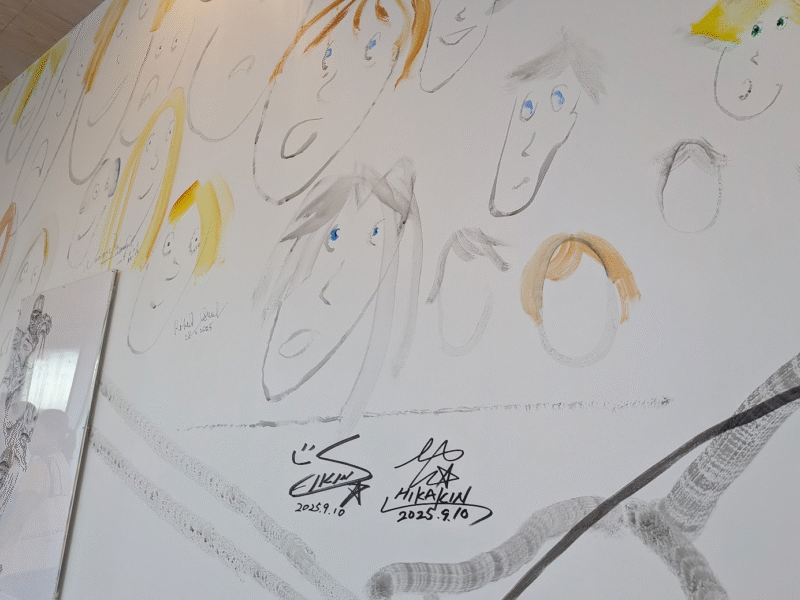 壁の絵と一緒にサインがいくつか書かれていました。そこにヒカキンのサインも発見。