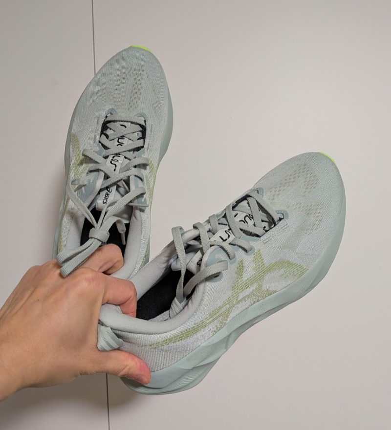 ちなみに、この”バネ感”の正体は、アシックスが採用している高反発クッション素材によるものらしいです。NOVABLASTは、クッション性だけでなく反発力も重視した設計になっていて、着地した衝撃を吸収しつつ、その力を前方向への推進力に変えてくれます。